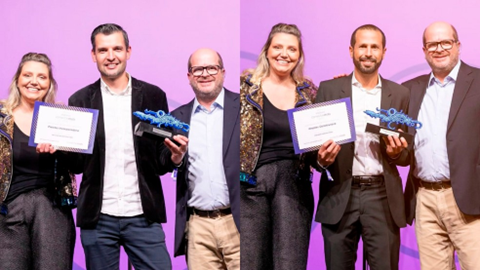 Marcos Carneiro e Jeremie Sebban, com os troféus das duas categorias — Foto: Conecta Imobi